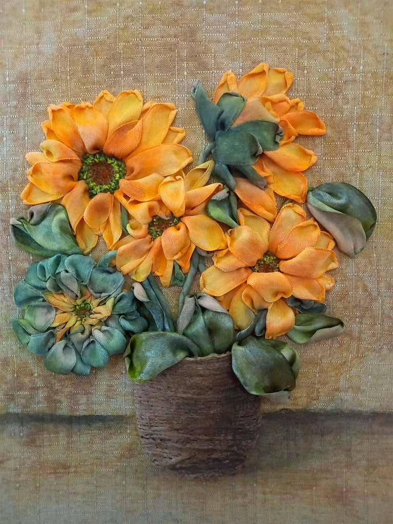 “I love different kinds of embroidery, especially silk ribbon embroidery, because it gives a very nice volume effect. When I saw your works at the first time, I was very impressed. They are very gorgeous. Then I bought your book and started to learn a new art of embroidery. Currently I create embroidery designs and pictures, I combine acrylic painting and hand embroidery to make colorful and textural pieces. I would like to ask you to give your opinion about my works, it means a lot to me to become your professional opinion, of course if you have time for it.”
