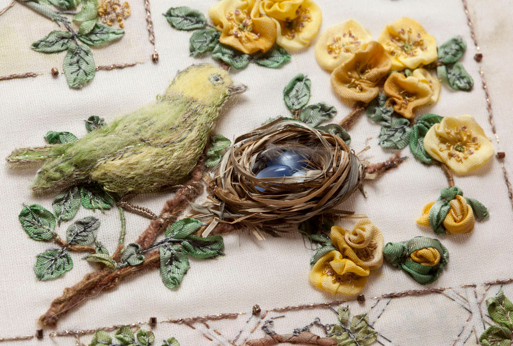 Use one strand of brown or grey thread and couch a feather or two in the centre of the nest. Bring needle and thread to top of work; place aside to use in the next step.