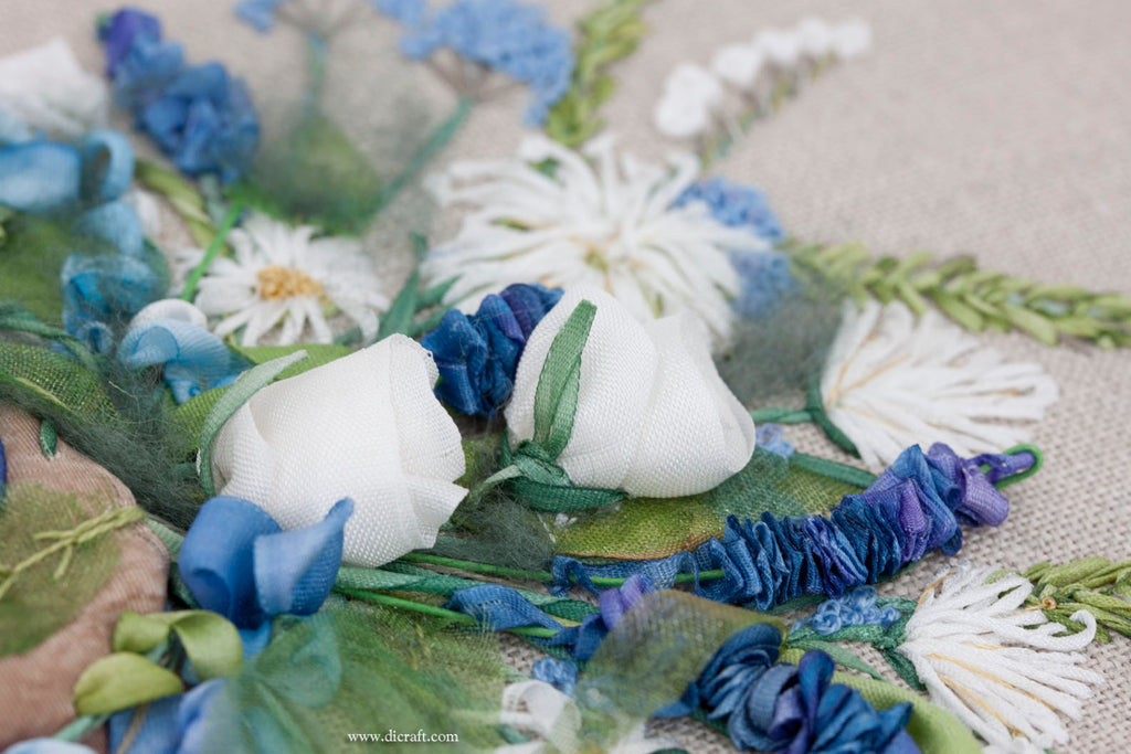 These white flowers do add to the beauty of this ribbon embroidery arrangement, don’t you think? Lisianthus, also called Texas bluebell, prairie rose or prairie gentian, is valued for its vibrant colours and attractive blooms.