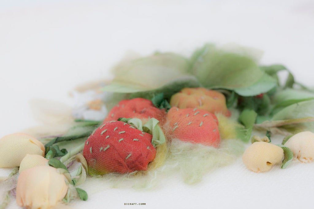 Make a few half-ripe strawberries. Note: these strawberries do not need any organza circle to cover them. Make running stitch along the edge with a matching thread and us pale yellow fibre to fill the shape. Secure onto your design.