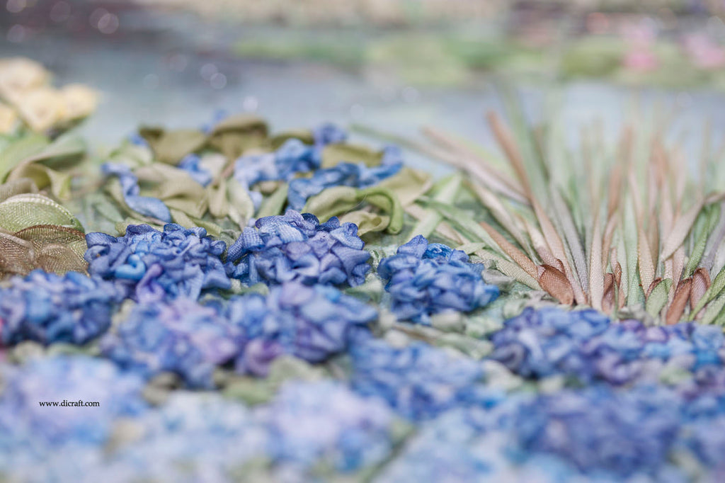 Work with Di van Niekerk’s 4mm silk ribbon no. 64, alternating with no. 89 for the darker petals and no. 123 for the paler blue petals. Use ribbon stitch, loose and puffed, to create the petals.