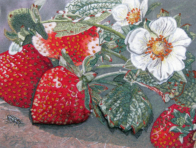 Elza decided that the strawberry and leaf in the front as well as three petals of the blossom would be excellent for stumpwork. Roby's paintings are so detailed and this makes them so easy to embroider....