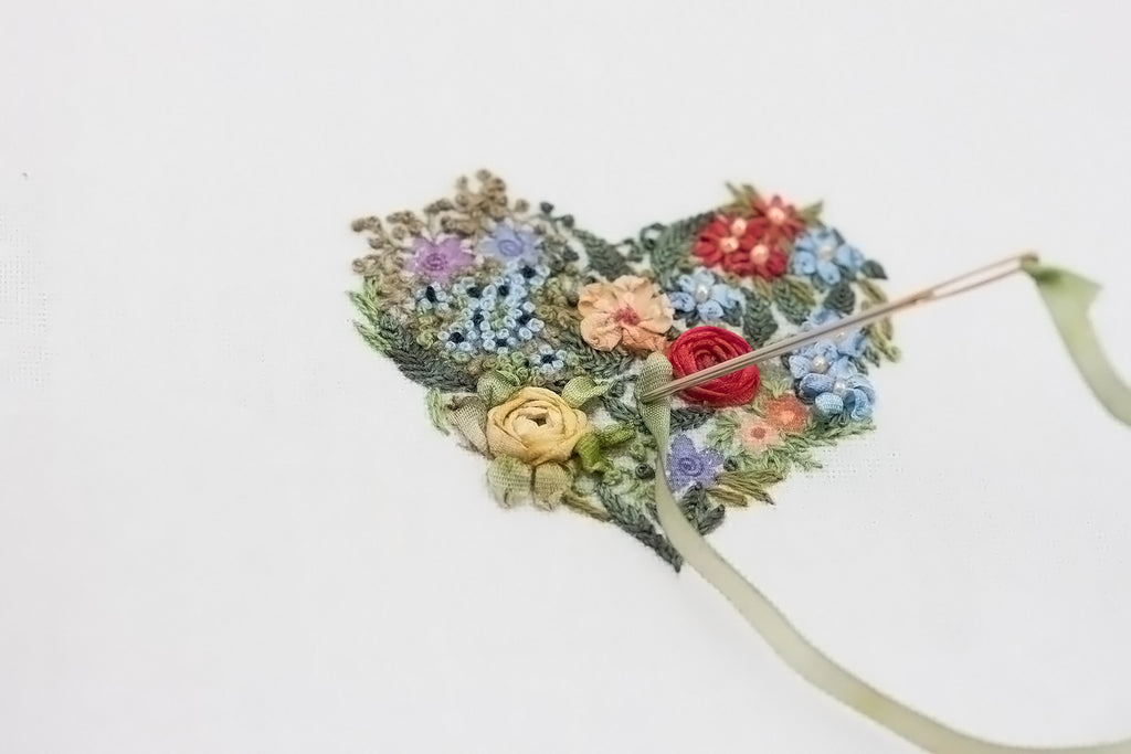 ‘Heart Love’ embroidered by Di van Niekerk. Original artwork is by a talented artist, Bronwyn Royce. The kit includes the guided instructions (with detailed photography) by embroidery artist and teacher Di van Niekerk.