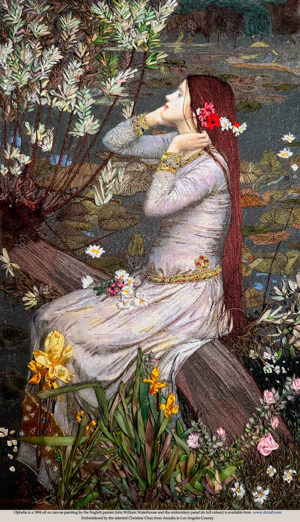 The gold detail on her dress can be stitched with the Madeira metallic threads in shades of gold and silver, adding a touch of emerald and red with tiny seed beads. The folds in her dress can be worked in straight and stem stitch. Use Rajmahal Art. Silk threads (1 strand) or any fine silk or Rayon thread that will complement the dress.