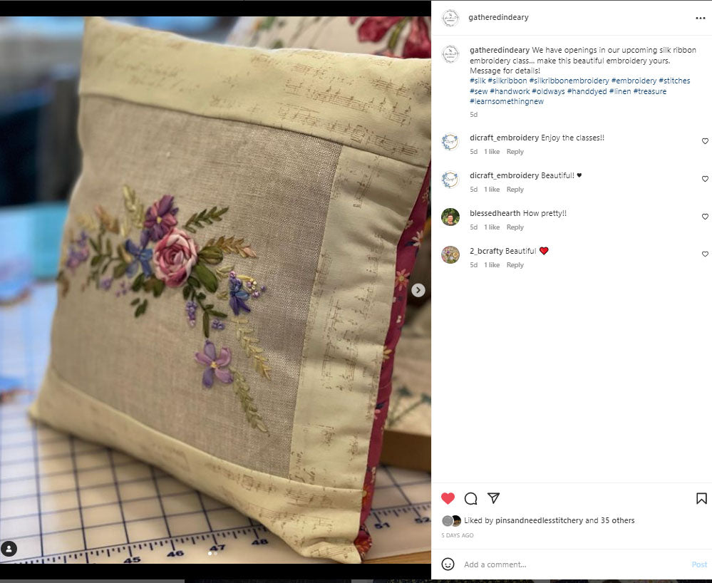 Hi everyone! Just to let you know that the talented Lisa French of the beautiful store, Gathered, in Deary, Idaho is offering classes in silk ribbon!