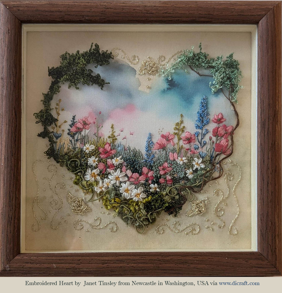 Hello, stitching friends! Today, I have something truly special to share with you – a stunning heart design by the talented Janet Tinsley from Newcastle in Washington, USA. Janet participated in our Embroidery Heart Challenge, and her piece truly deserves first prize! Congratulations, Janet – this masterpiece is something to be incredibly proud of ♡♡♡