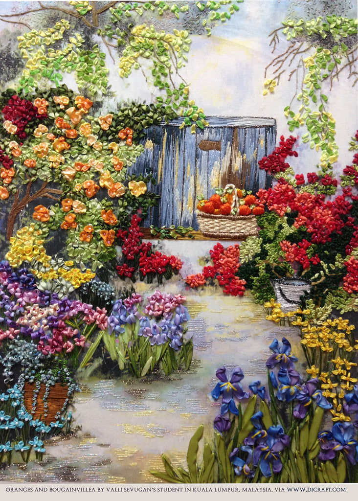 I am Valli Sevugan. I am an Indian residing in Malaysia. I conduct art and embroidery classes here in Kuala Lumpur. Embroidery has always been very close to my heart, and me being a total “flower lover”, ribbon embroidery, especially, has become a passion. From the very first time I saw a ribbon-embroidered picture (while flitting through TV channels on a local tv channel), I was hooked on to it totally.