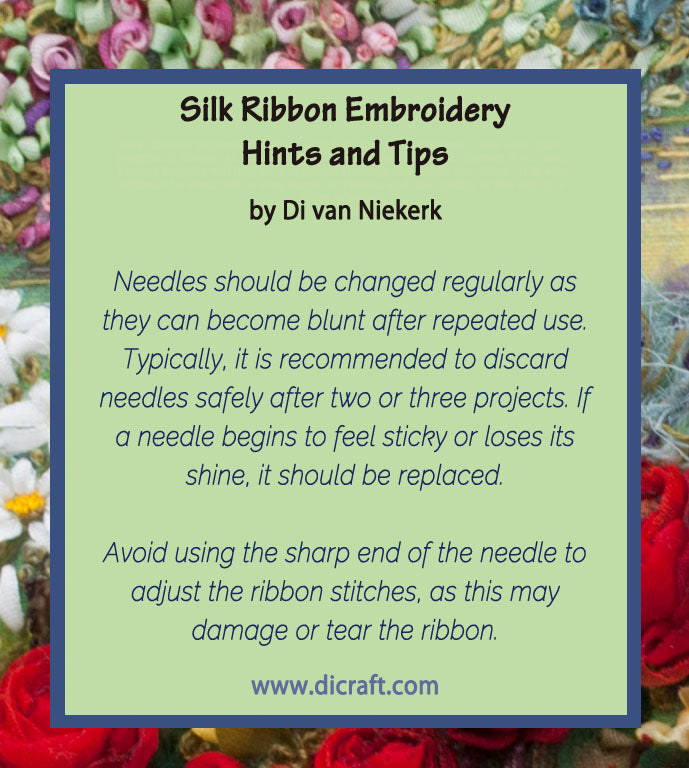 Needles should be changed regularly as they can become blunt after repeated use. Typically, it is recommended to discard needles safely after two or three projects. If a needle begins to feel sticky or loses its shine, it should be replaced. Avoid using the sharp end of the needle to adjust the ribbon stitches, as this may damage or tear the ribbon.