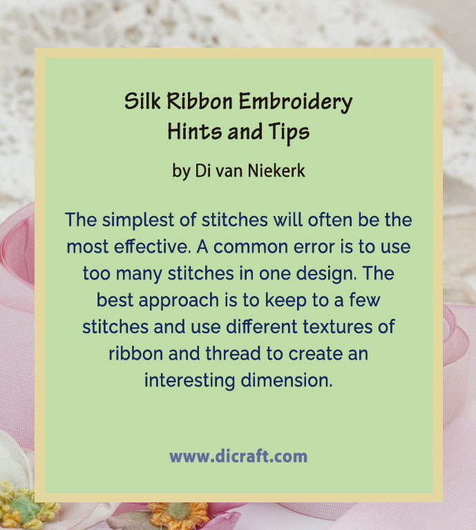 The simplest of stitches will often be the most effective. A common error is to use too many stitches in one design. The best approach is to keep to a few stitches and use different textures of ribbon and thread to create an interesting dimension.