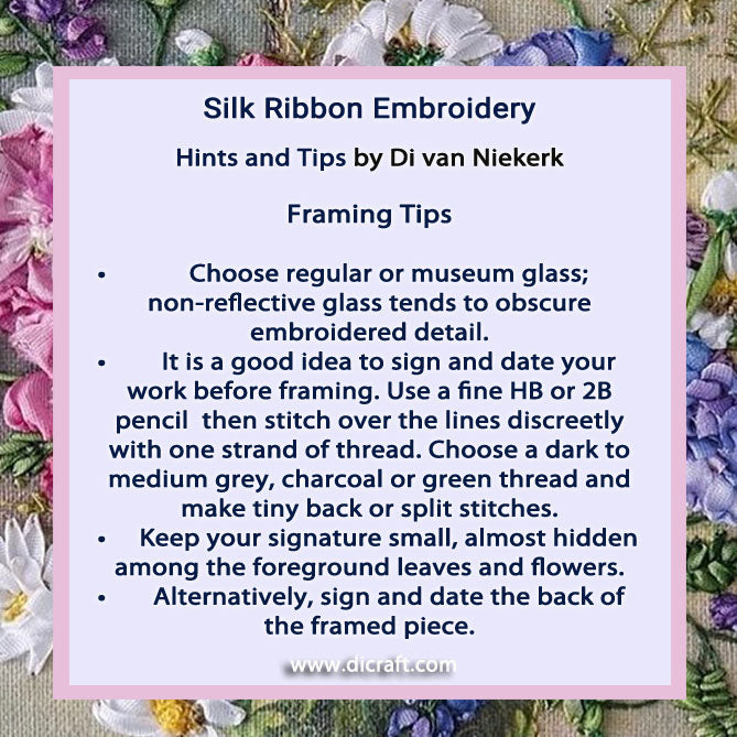 • It is a good idea to sign and date your work before framing. Use a fine HB or 2B pencil then stitch over the lines discreetly with one strand of thread. Choose a dark to medium grey, charcoal or green thread and make tiny back or split stitches.