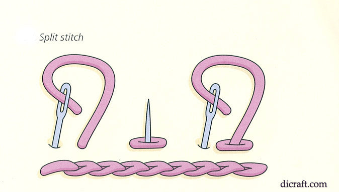 Split stitch is ideal for outlining shapes and useful when making a layer of stitches for padded satin stitch. It's can be worked in 1 or 2 strands of thread - cotton or silk.