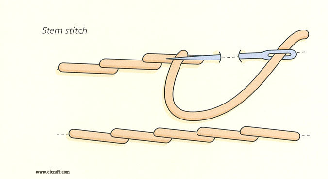 Stem stitch. A slight variation on the traditional stem stitch, this is a way to form a finer line which works well with this kind of embroidery.