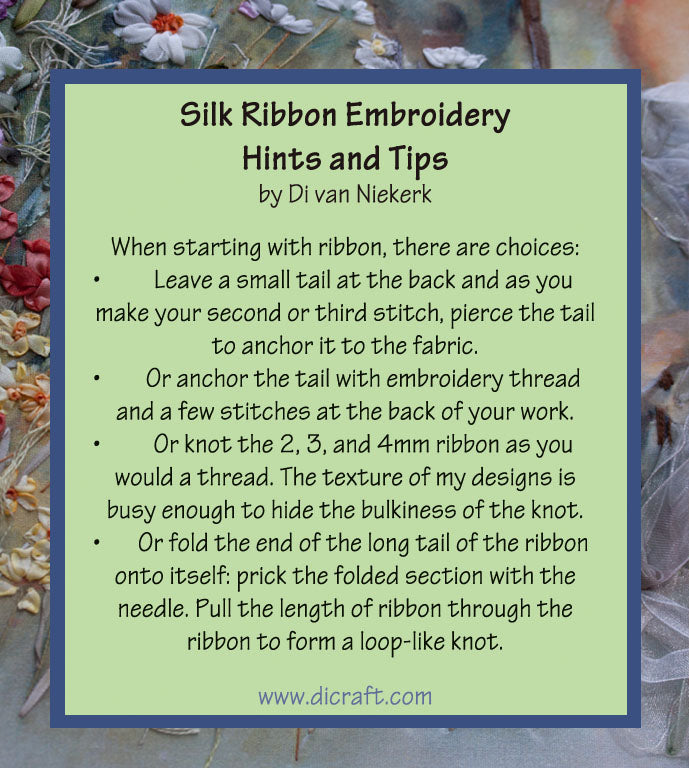 Silk Ribbon Embroidery Hint 3 by Di van Niekerk From a series of handy hints and tips for silk ribbon embroidery to save and keep for your collection. You are most welcome to share with your students or friends. I will be adding a new card every week until the series is complete. This is Hint 3… . When starting with ribbon, there are choices: • Leave a...