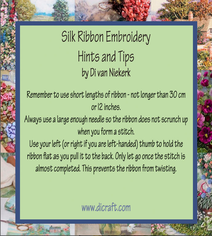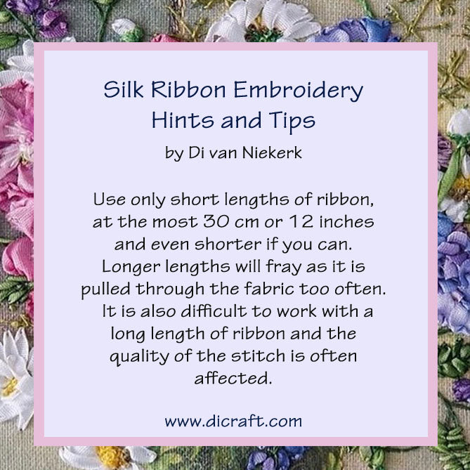 Monday Hints and Tips by Di van Niekerk's Silk Ribbon Embroidery About the Different Ribbons . There is an amazing collection of ribbons in our range and these are available from our website www.dicraft.com. Pure silk and sheer organza ribbon are, without a doubt, the best ribbons to use if you wish to create a true reflection of nature’s colours They are soft and pliable ribbons and...