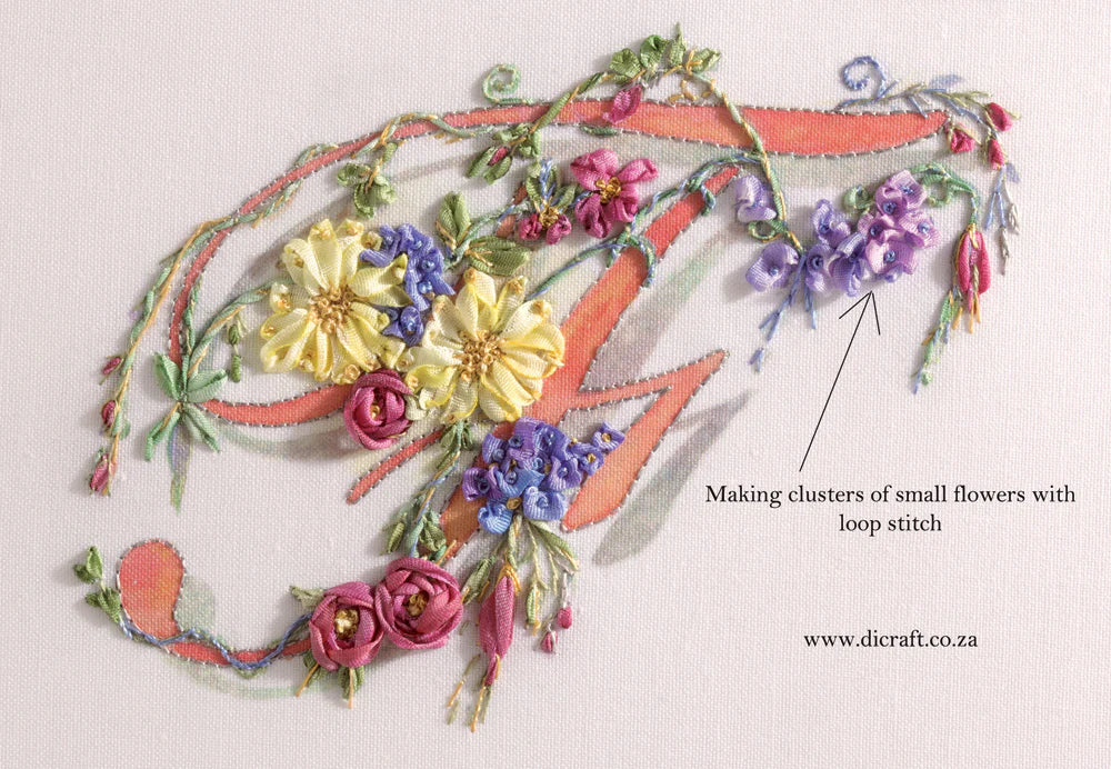 How to make cute little flowers with silk ribbon Loop stitch is ideal for making clusters of small flowers. It is an easy stitch to do and French knots are added afterwards to form the stamens. . . For this F monogram from my Embroidered Alphabets book, I used loop stitch for the little blue flowers. . . Step 1. Use 4, 7 or 13mm silk ribbon...