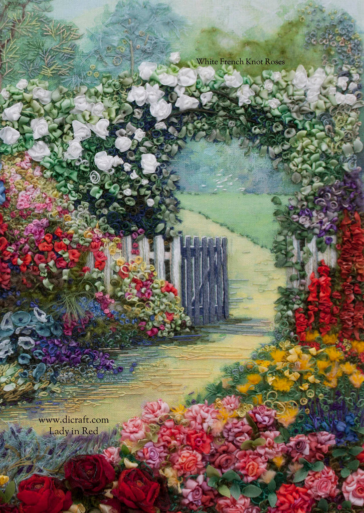 French Knot Roses See the white rose arch above the gate in this picture? These are French Knot Roses from our Lady in Red project/kit They are easy to make with stunning results and I will show you how on to this page. . . In Karen's instructions, she wrote: . White Rose Bush Make the French knot roses in Di van Niekerk's silk ribbon: 2mm and 4mm white (103) ribbon. Add...