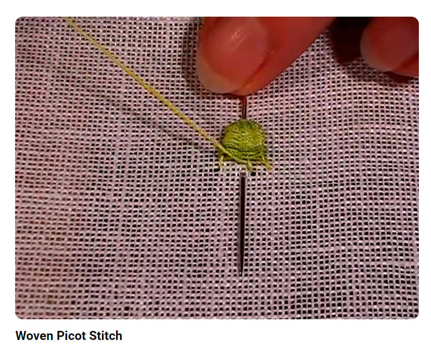 Woven PICOT STITCH by Di van Niekerk This is perfect stitch for long, loose leaves and the best thread for this stitch is Perlé 8 or 12 . To make a fatter leaf, keep the tension loose as you weave in and out of the foundation stitches. Remember to use a long length of thread if the leaves are long. The soft sculpture/doll's needle (about 13 cm long) that is used...