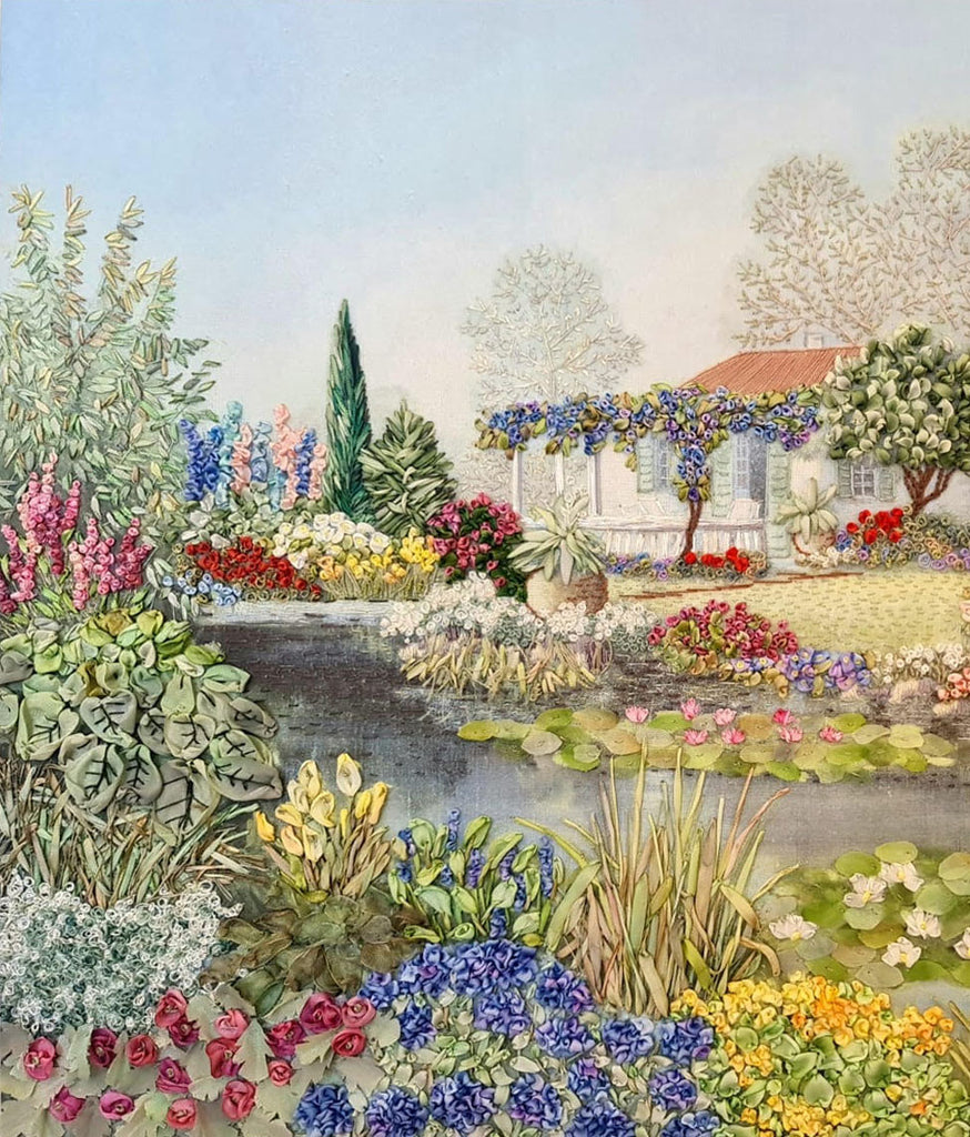 Absolutely gorgeous silk ribbon embroidery by the super-talented Anat Matza from Israel.Anat ordered Box Full of Lessons 8 from us a while back (it's on special offer while stocks last) and this is what she made!! It's beautiful and I am sure you will agree! . Have a closer look. Don't you love her yellow Canna Lilies? Love the leaves too. . and her water...