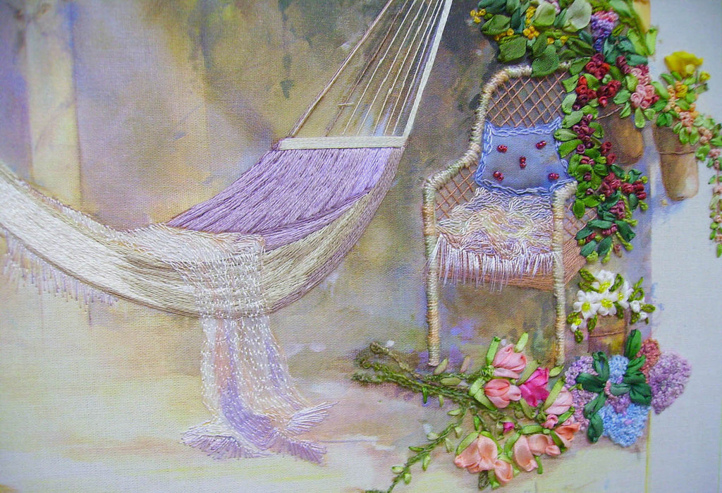 Silk Ribbon Embroidery Post by Di van Niekerk Look at this lovely hammock scene by Denise Westgate! It just makes me wish I was lying on it right now and with the holidays coming up, that could be a possibility for a lot of us! Or a dream... . . I'll show you some of the details close-up... . . . and don't you just love...