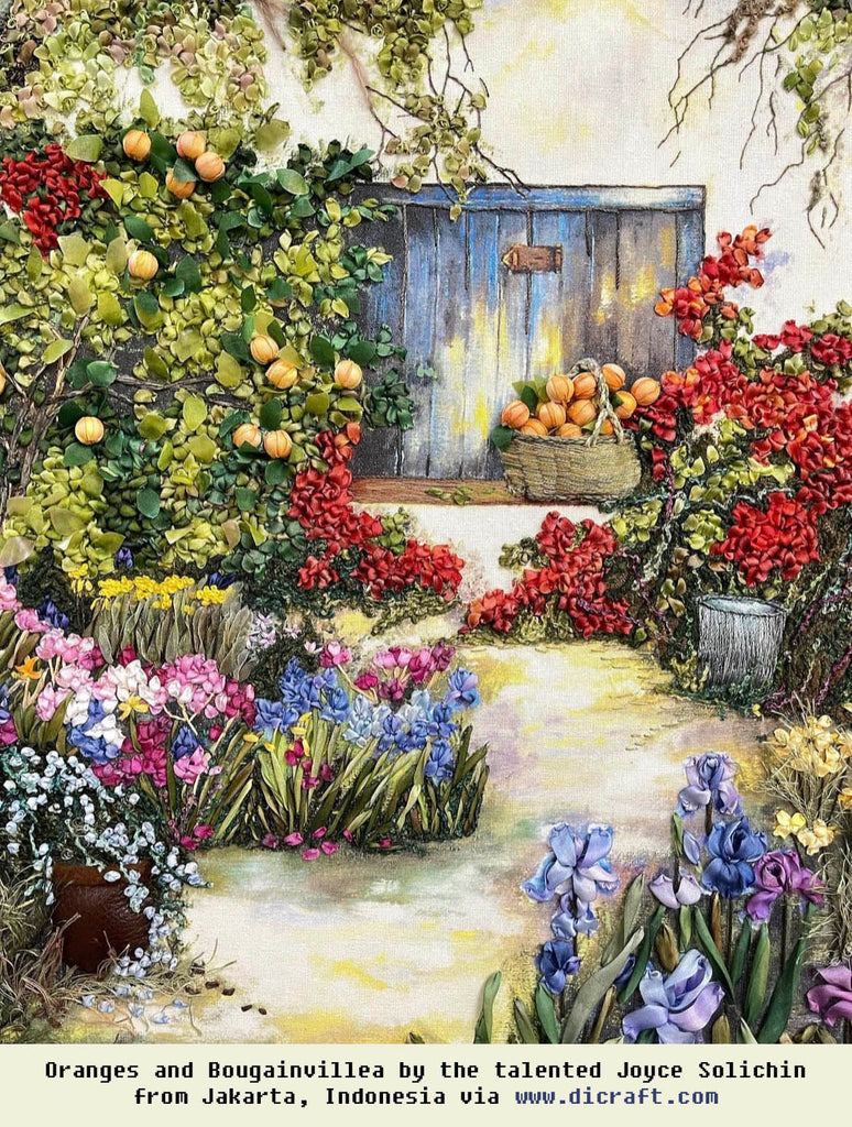 “Oranges and Bougainvillea” . Before we start, one question for you. Would you like me to teach you how to make the lovely oranges with silk ribbon? Please go to my Facebook or Instagram pages to answer under the oranges and Bougainvillea design. Please tell me whether you would like to learn how to make the oranges and mention where you are from. It’s always interesting to...