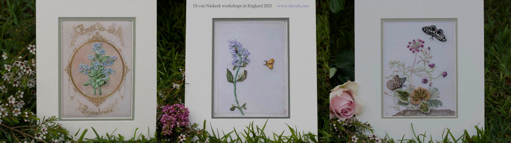 In this workshop, you will learn how to create interesting 3-dimensional effects with embroidery. You will learn how to make stumpwork butterflies and leaves using a needle painting technique. I will show you how to make the delicate, twirled Campanula stems and leaves and how to form lifelike flowers with variegated silk ribbon.