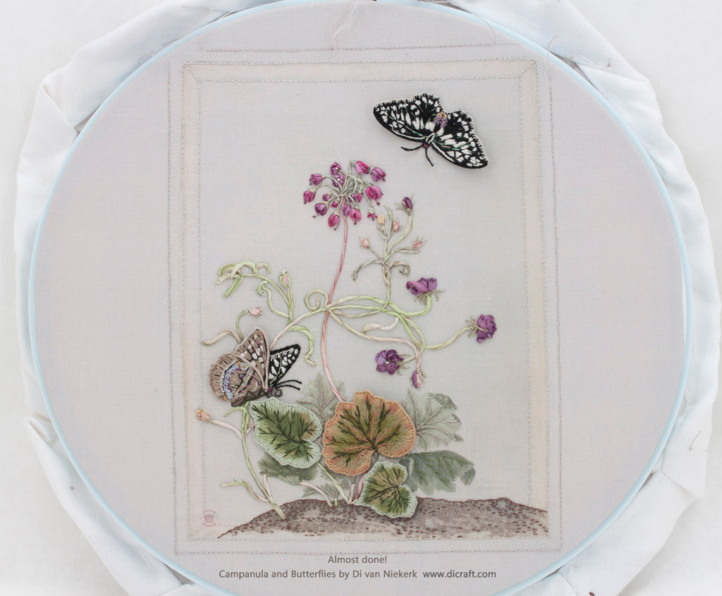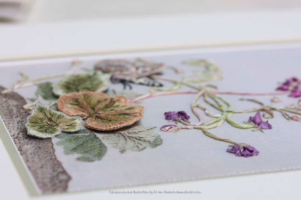 In this project, you will learn how to create interesting three-dimensional effects with embroidery. You will learn how to make stumpwork butterflies and leaves using a needle painting technique. We show you how to make delicate, twirled Campanula stems and leaves and how to form lifelike flowers with silk ribbon.